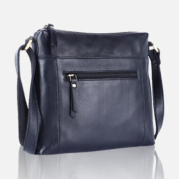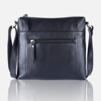 A stylish black leather crossbody bag for women, sized 28x11x21.5 cm, featuring a front zippered pocket and an adjustable strap. Simple and elegant, perfect for everyday use.
